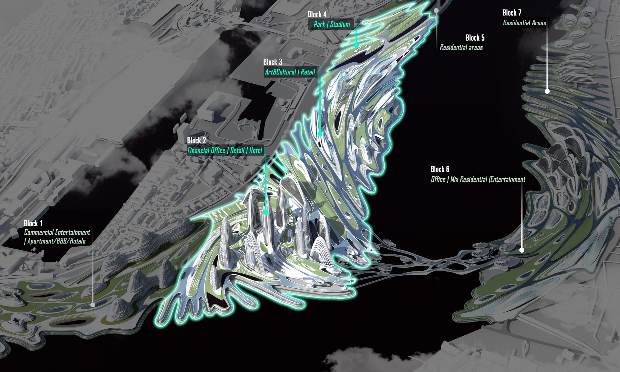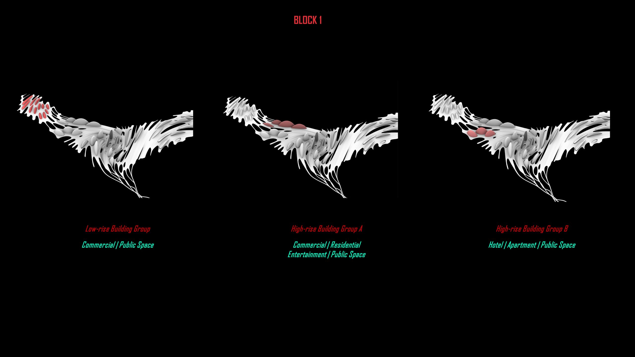 And for the high-rise building of block 1, we use the same bridge language and use horizontal curves to split the shape to distinguish different functions.