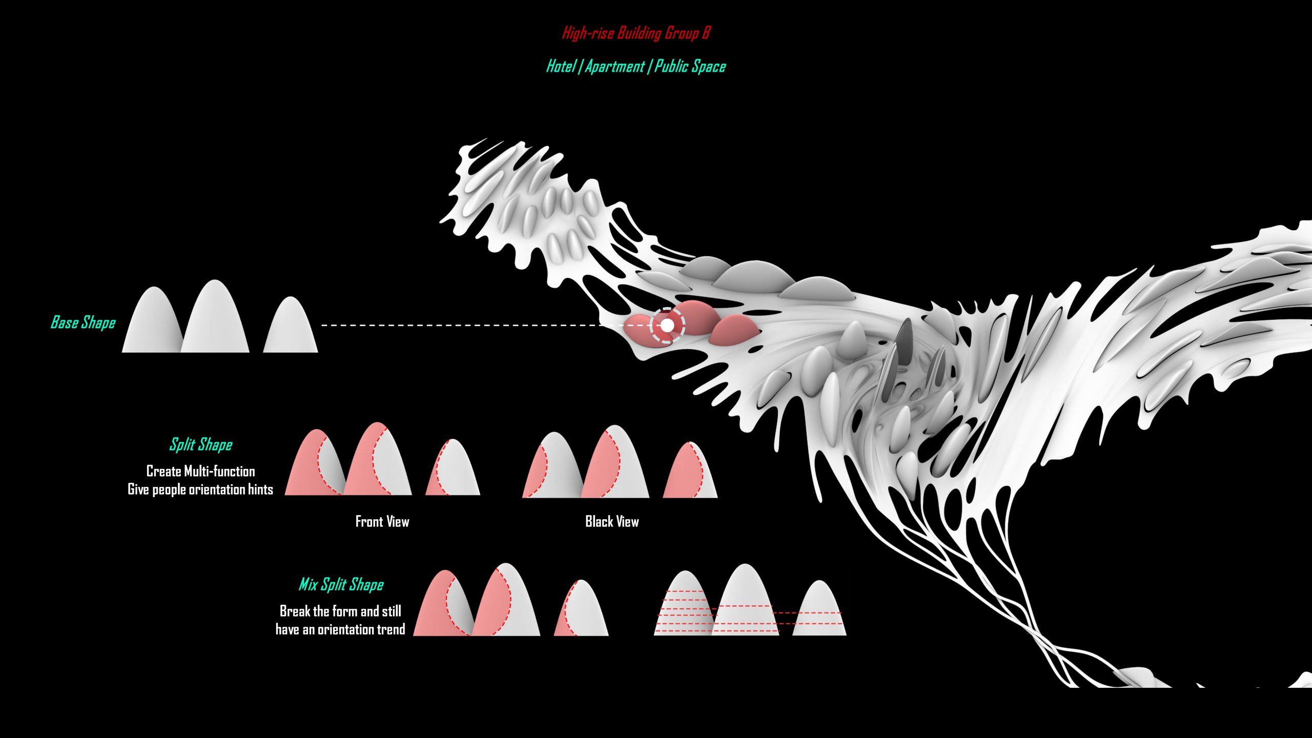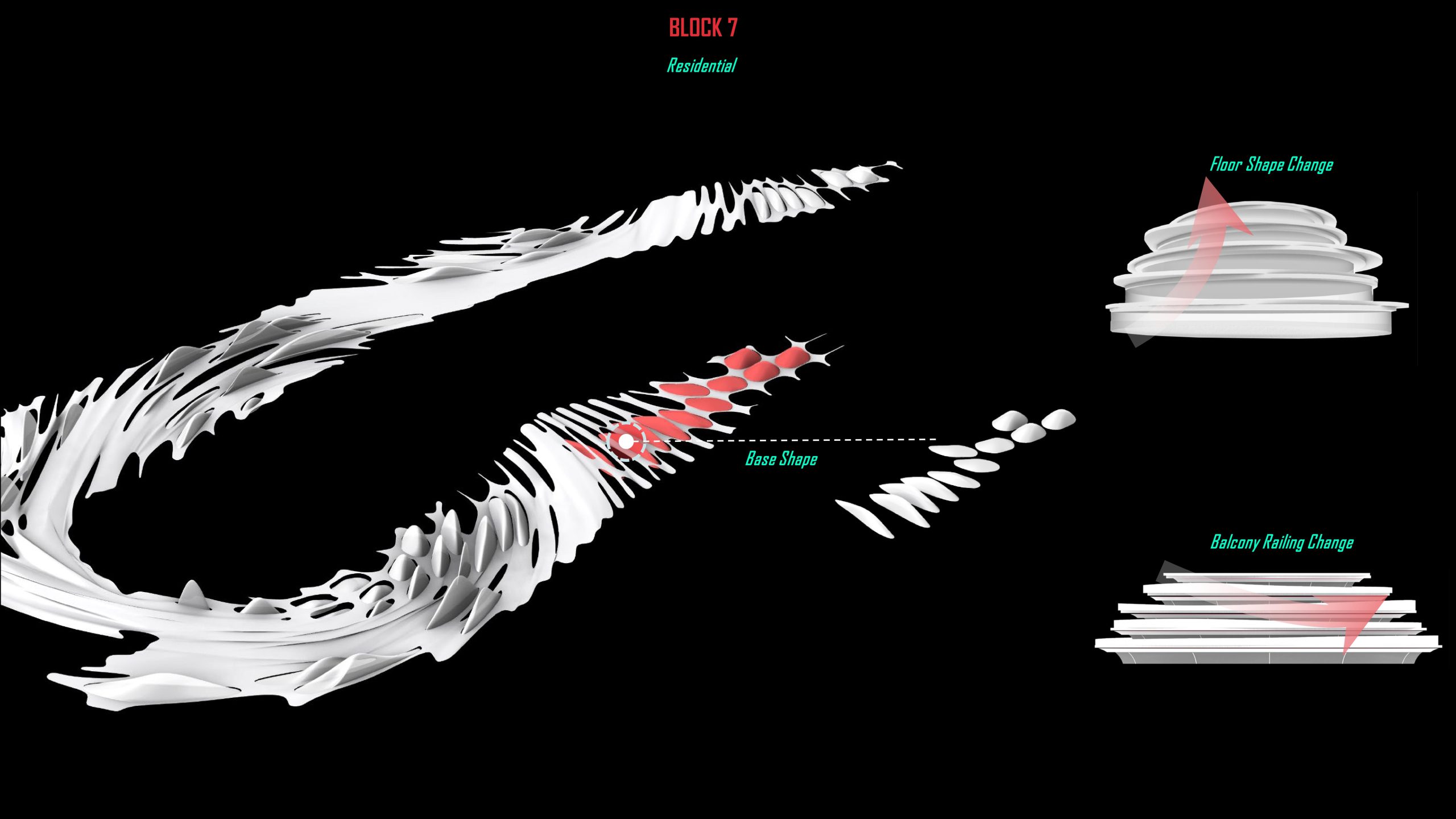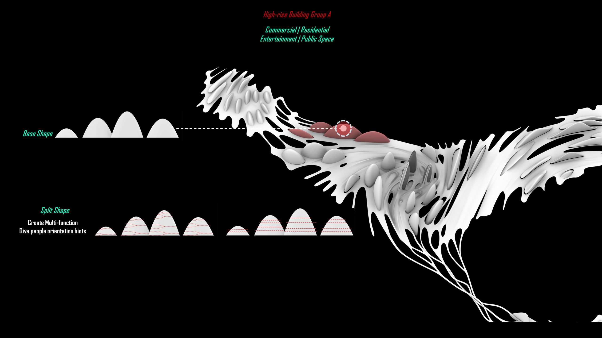 For building massing above the twirl skin, we examine the possibility of a series of architectural form languages gradually shifting across different volumes.