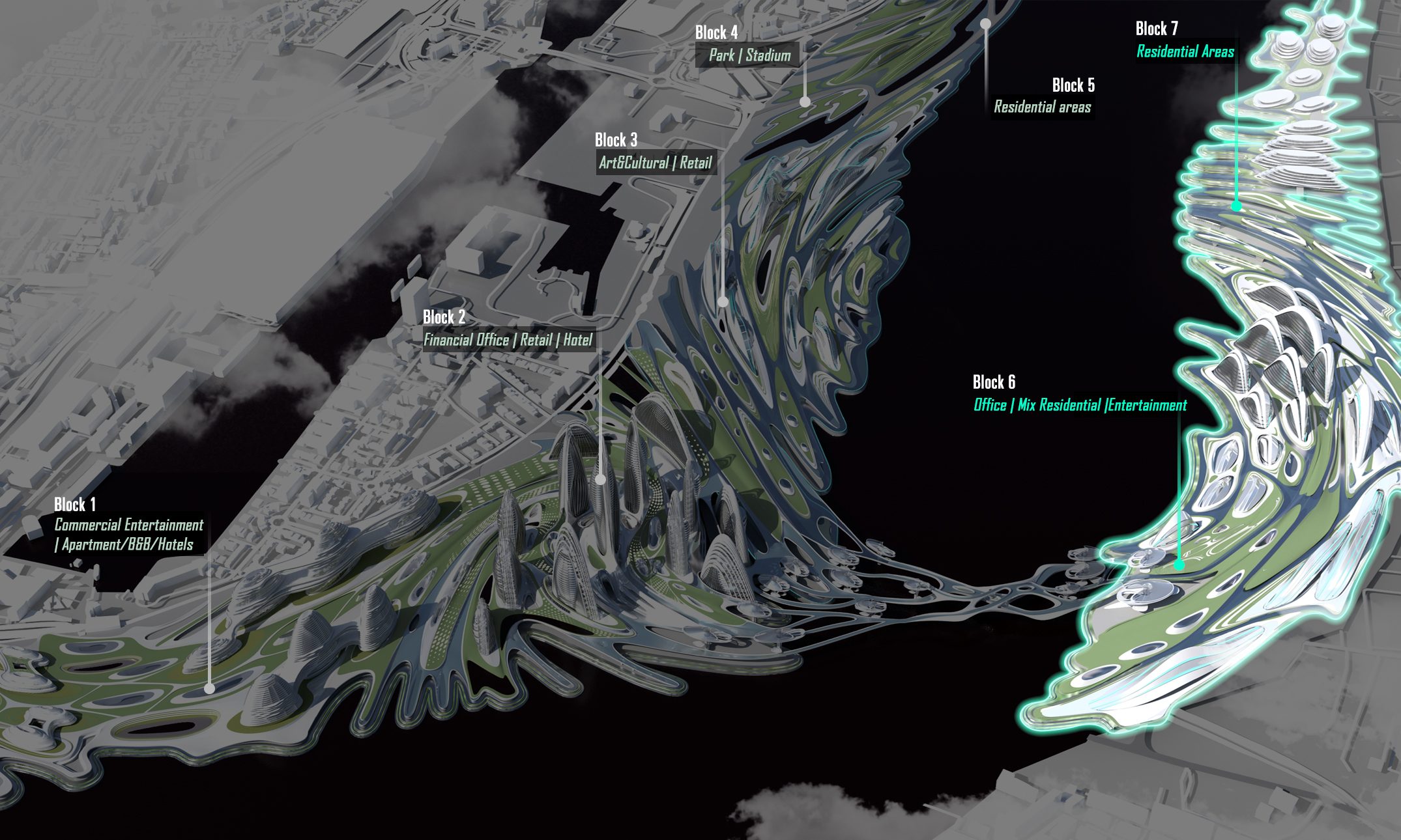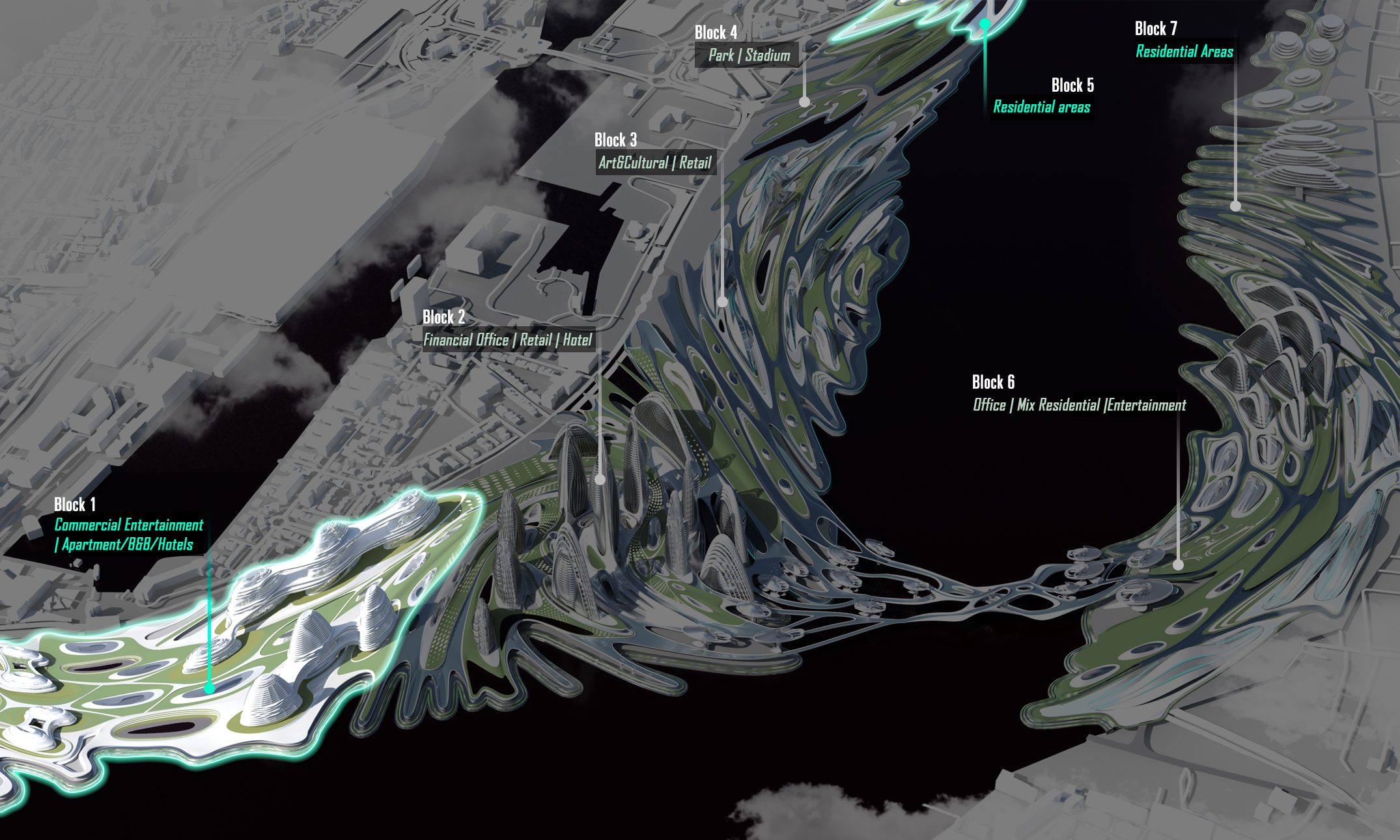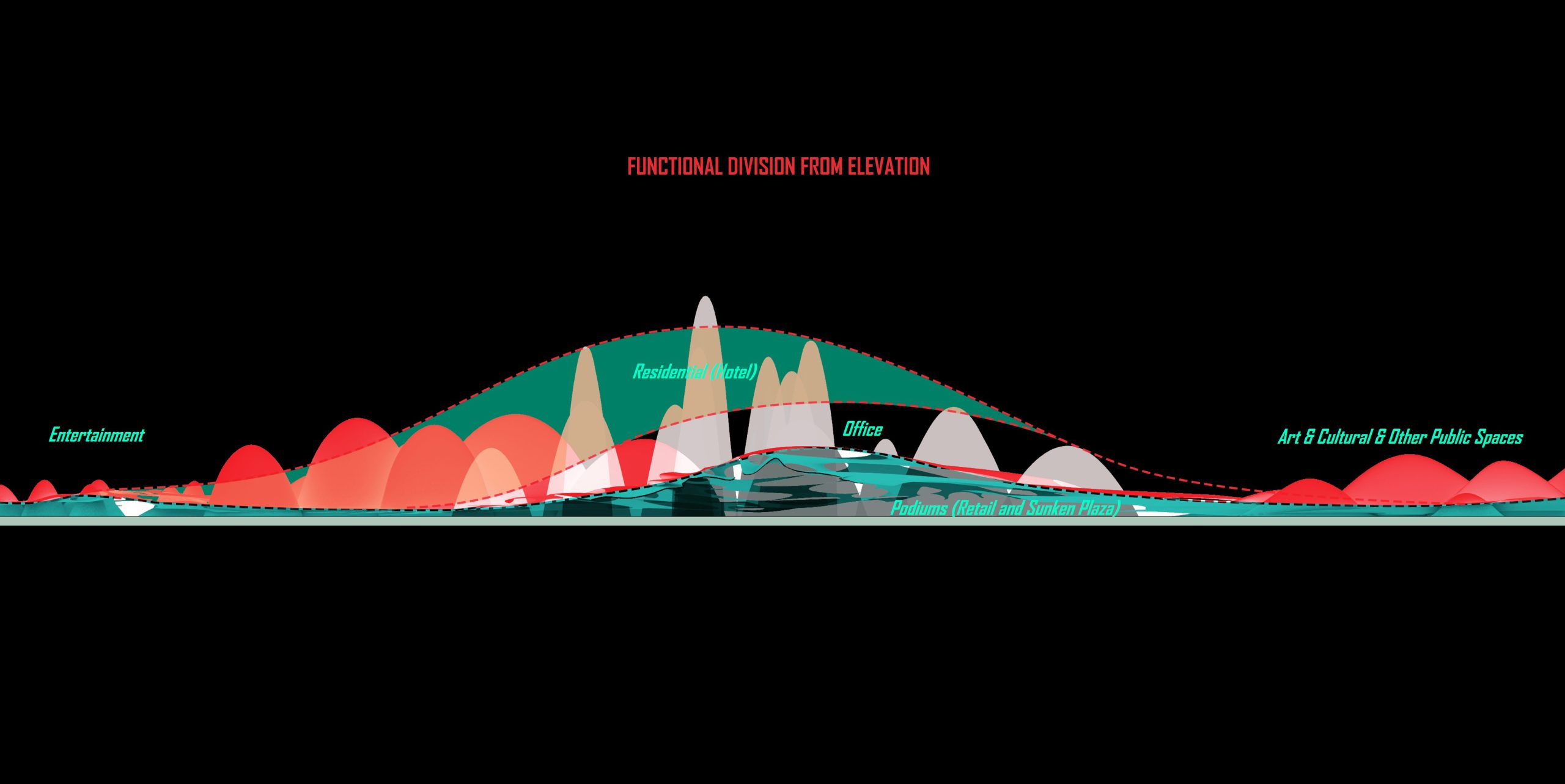 Firstly, We split the master plan based on its morphological feature and assigned them different mix functions with a dominating usage. We will introduce them in three chuncks based on the hierachy to the central junctional area.