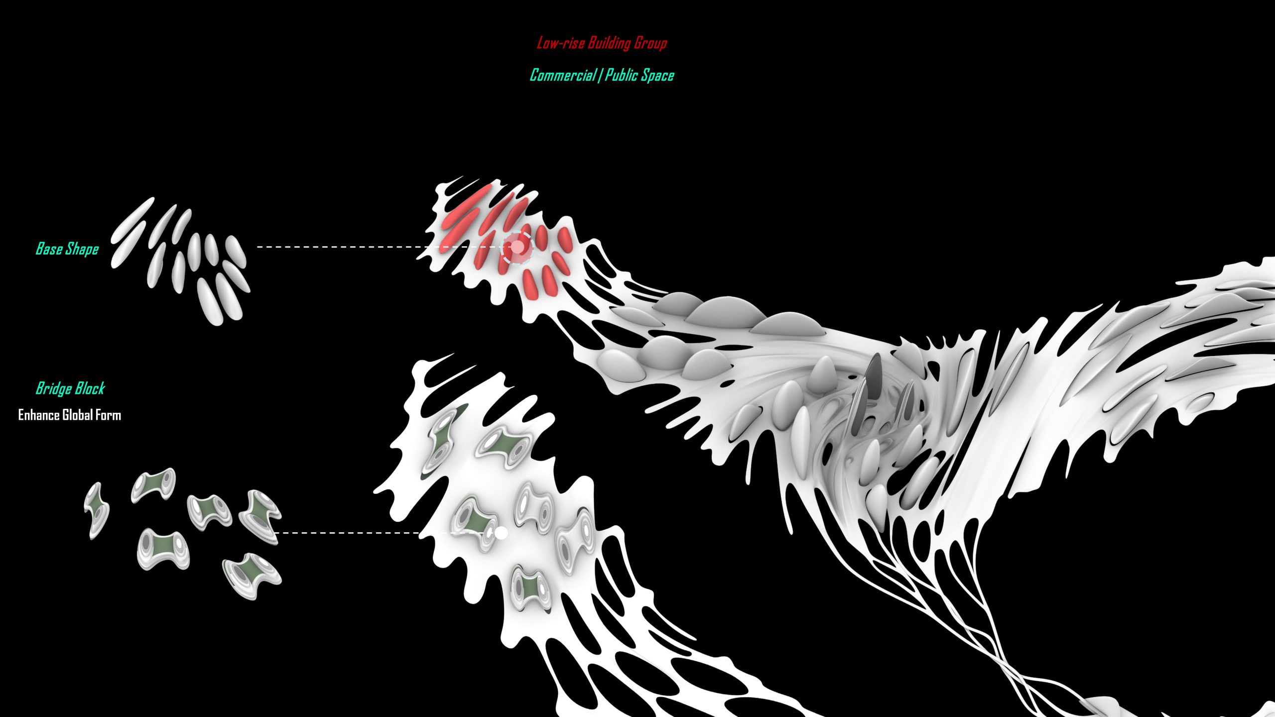 For the low-rise buildings of block 1, the main function is commercial. We start from the base shape that we generated before and try to bridge them.