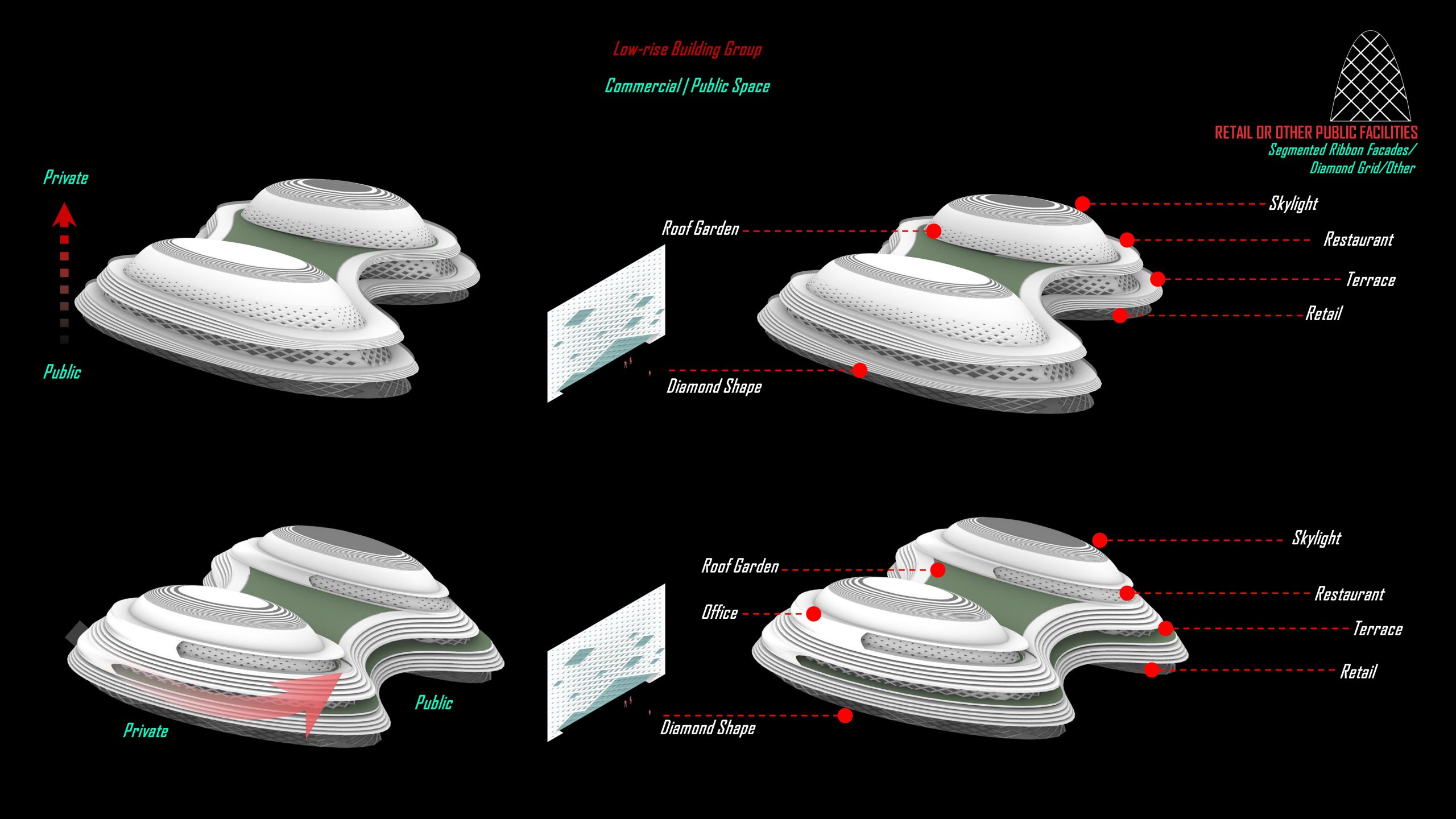 We want it to make the transition from public space to private space, For example, from retail space to office space, we use the diamond shape pattern and change the size of the window to make the gradient.