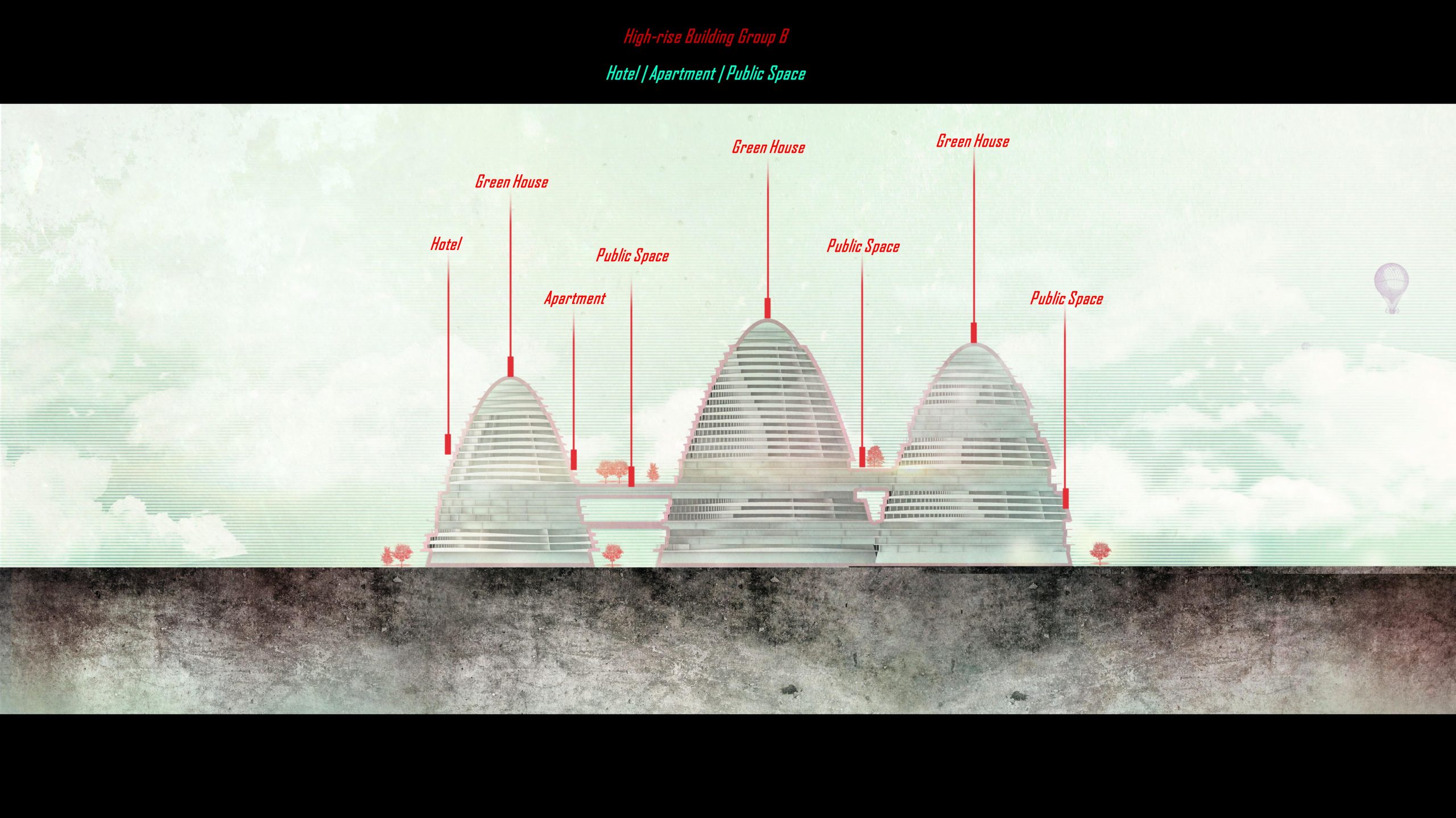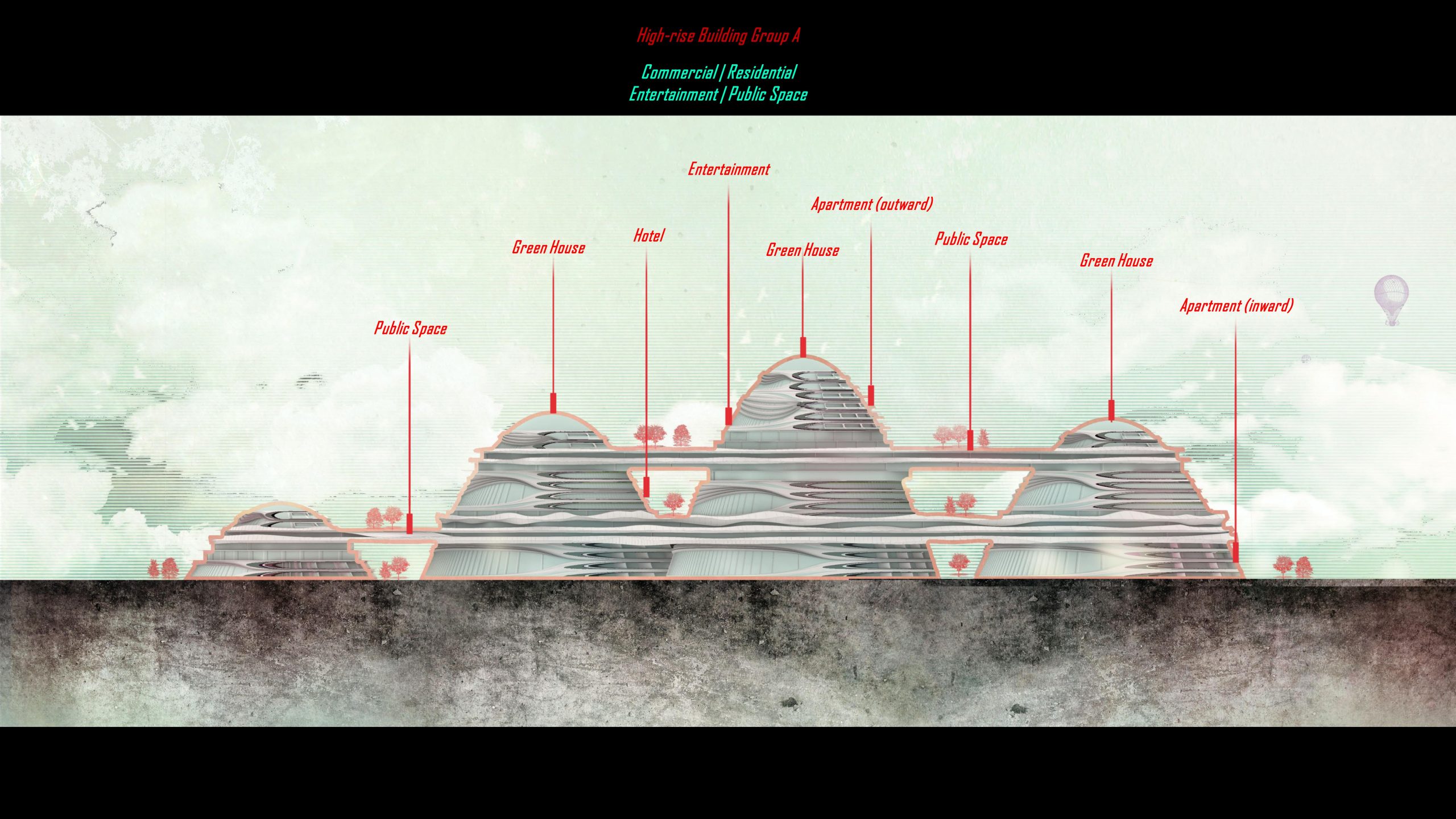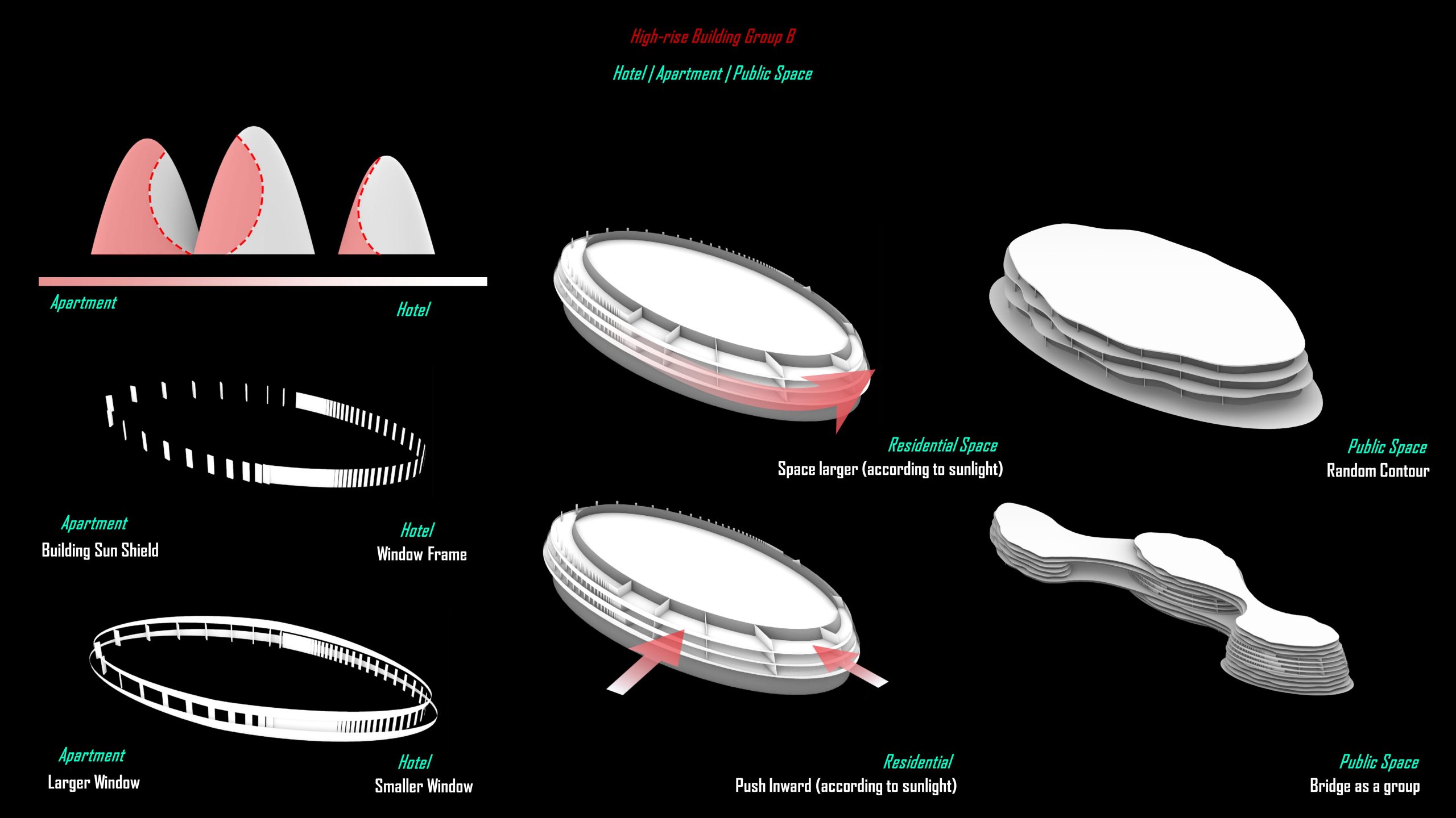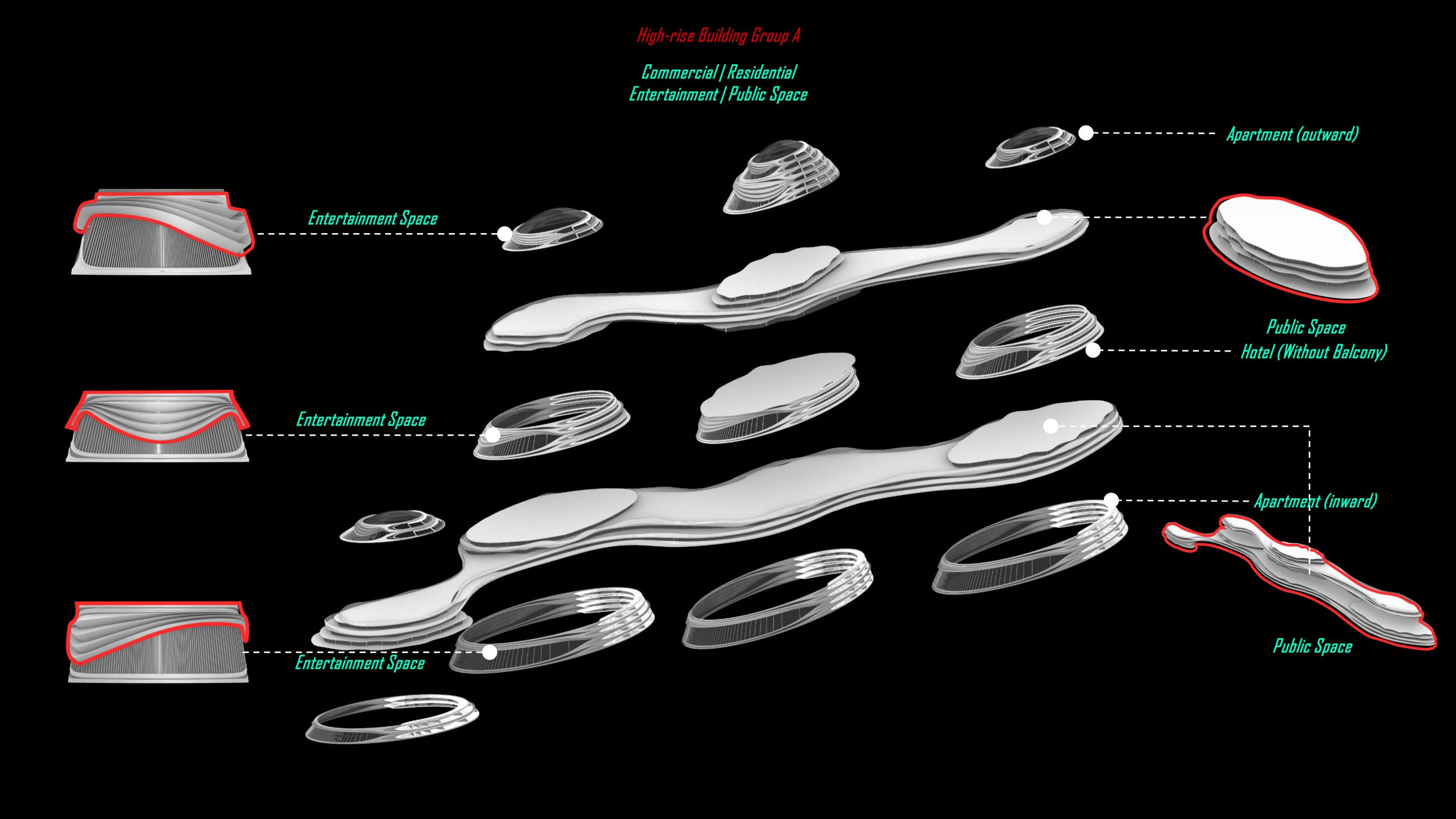 For the last three towers, we use vertical curves to split hotel and apartment space.