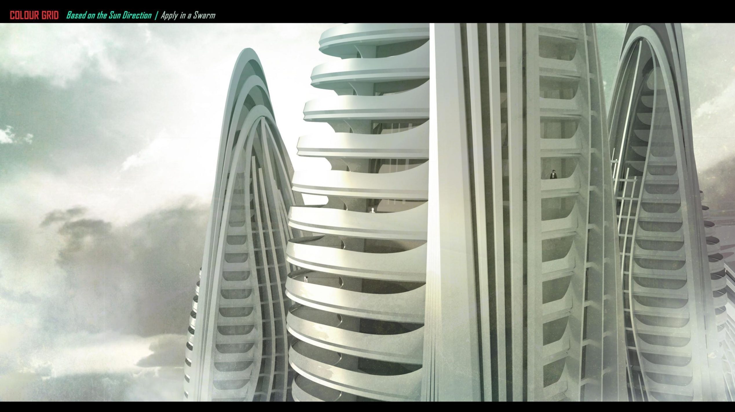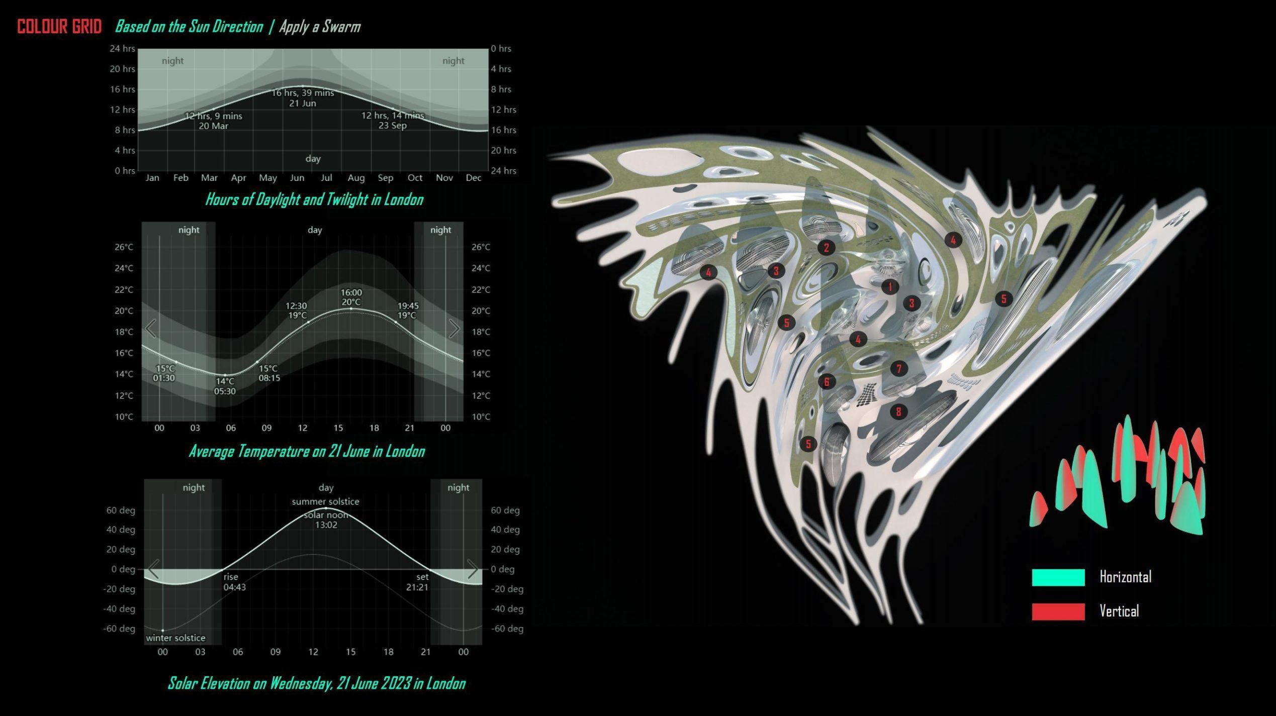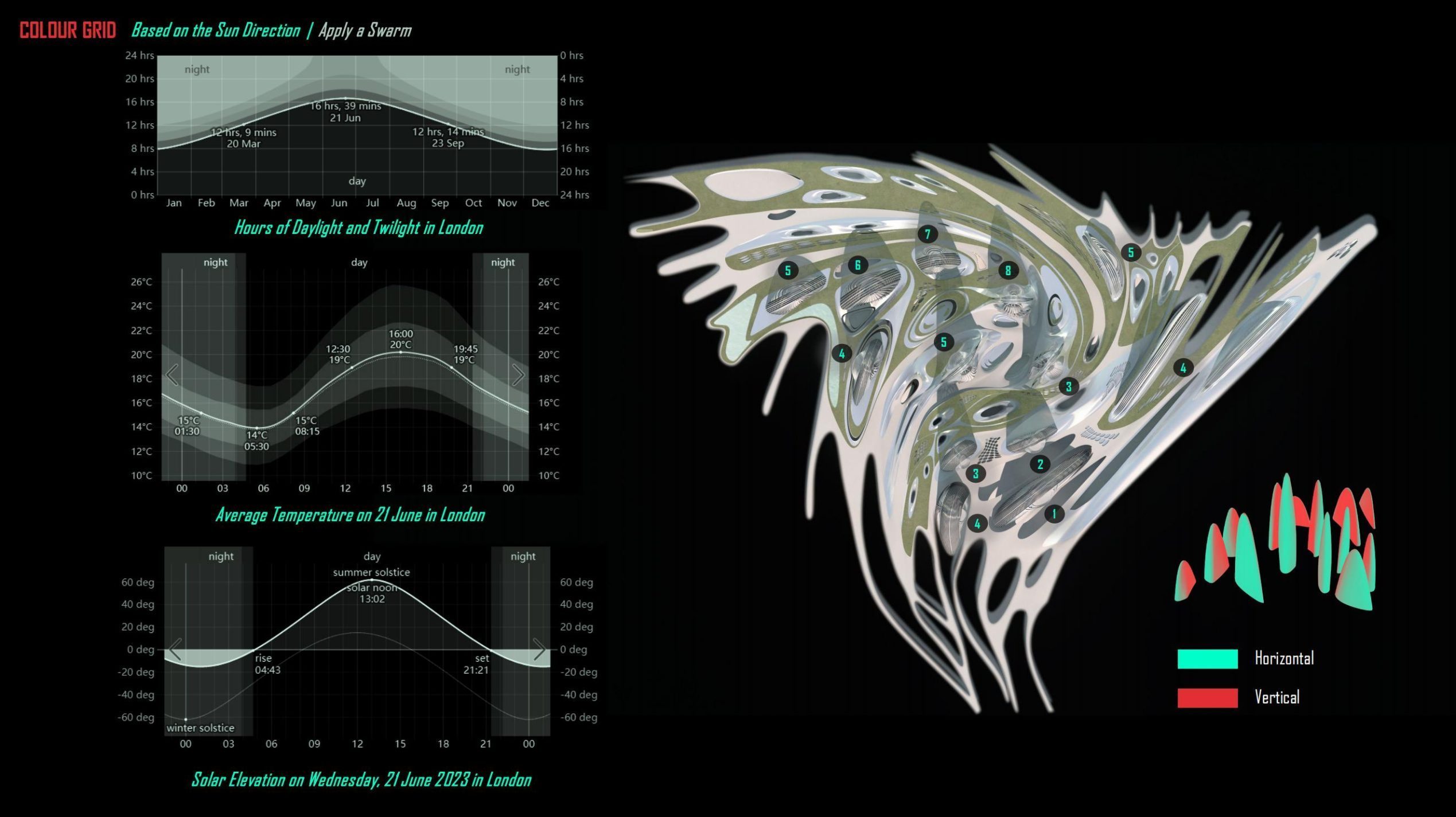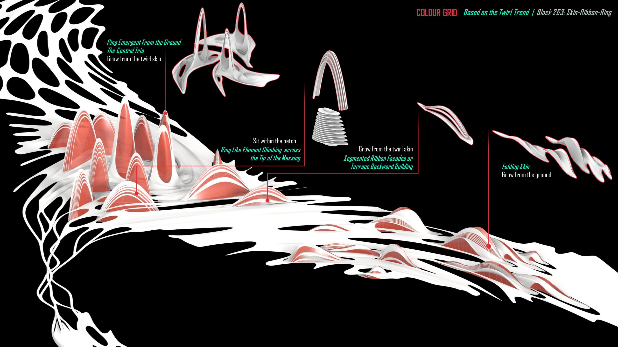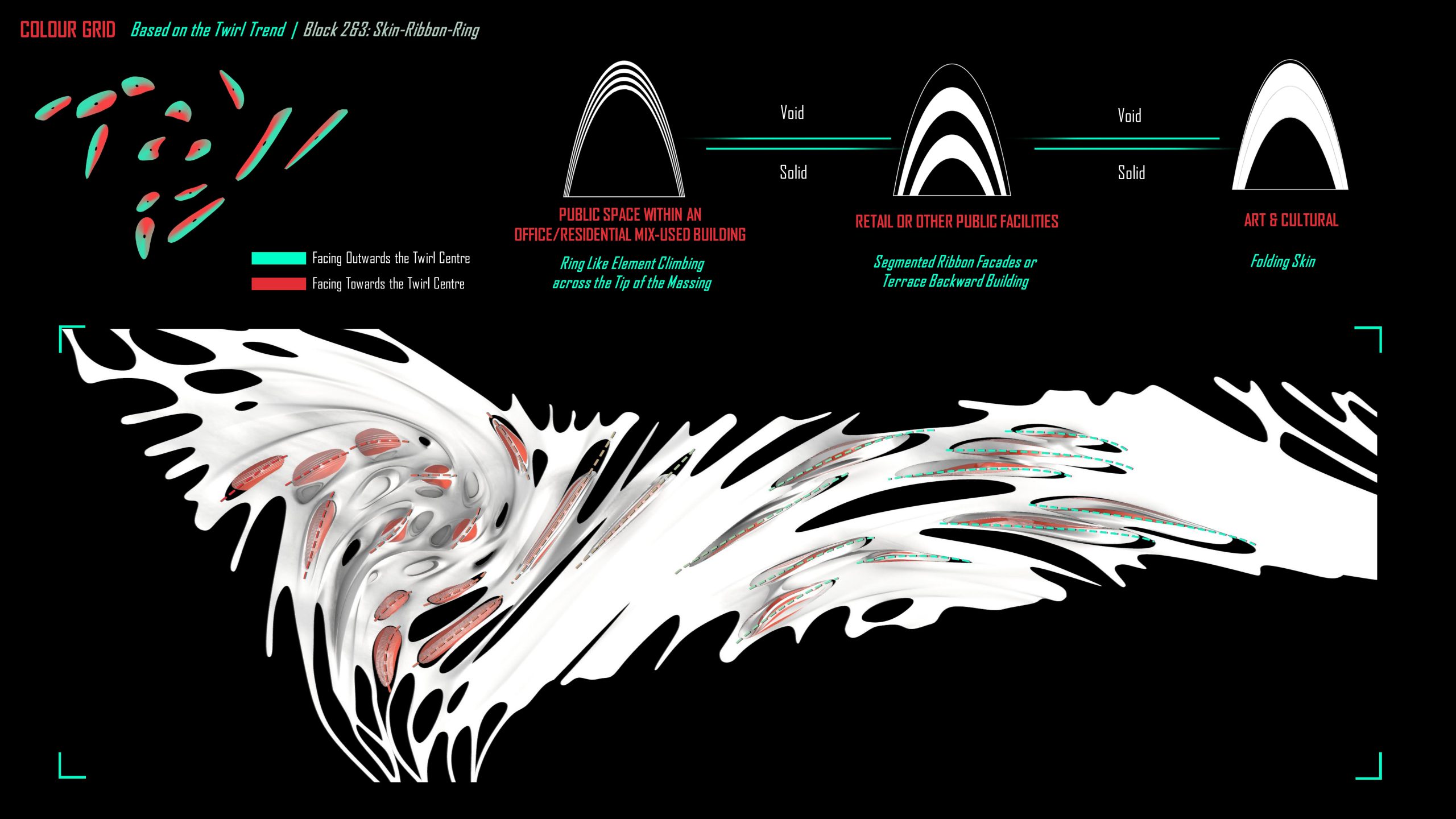 Viewing the colour coding based on the twirl trend in a top view, this trend-following demarcation line provides a top-climbing position for the architectural form in the following design.