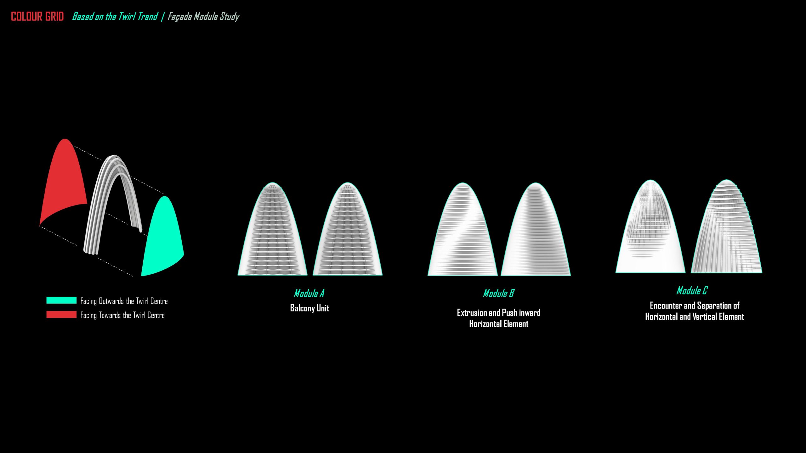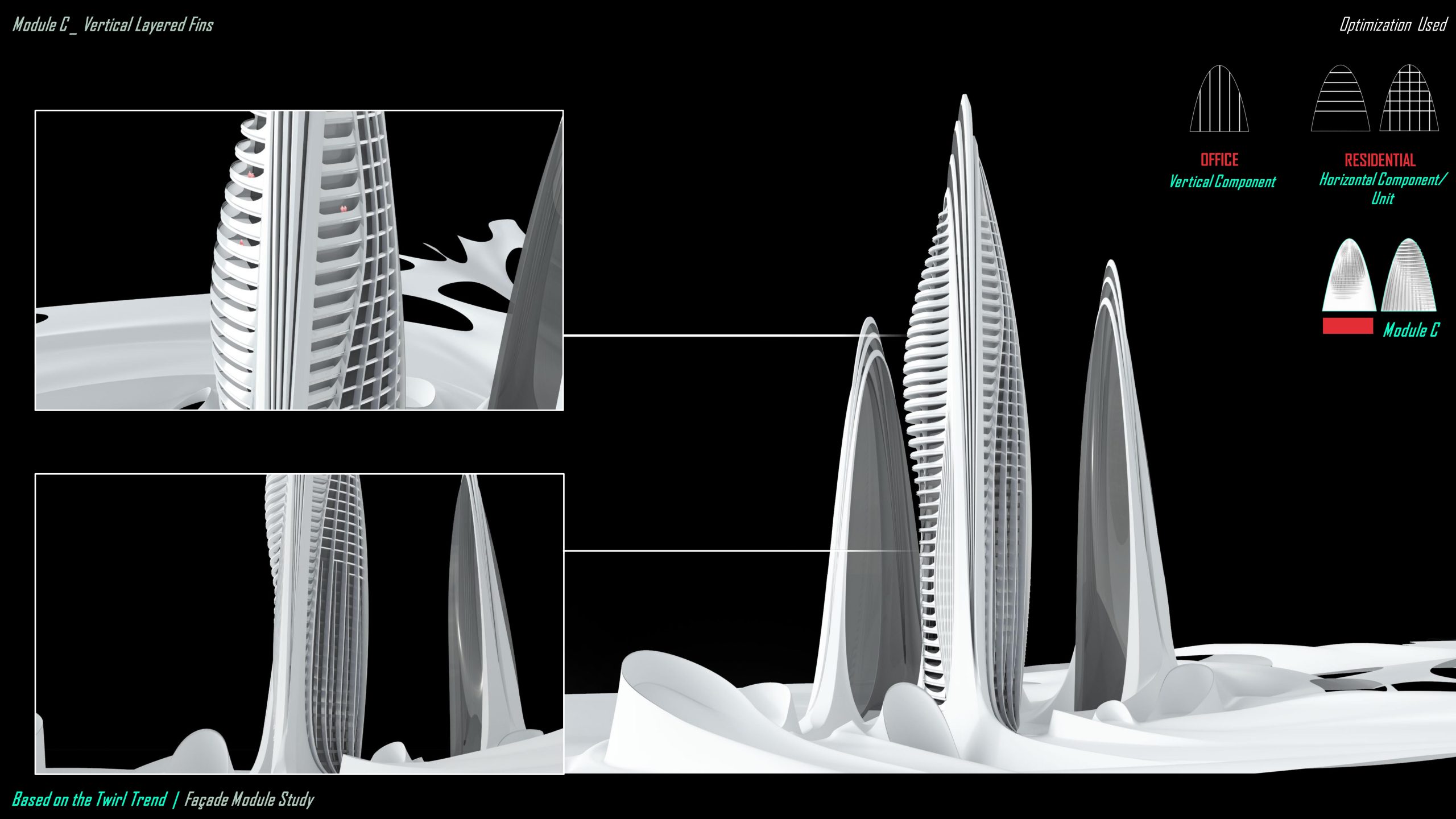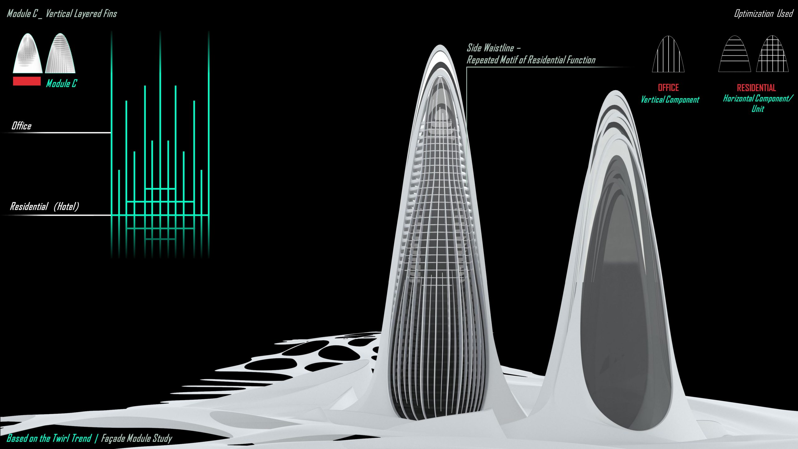 For the mainly vertical module C, we tried layered fins to align with the contour, and where the layer ends can result in a curvature, emphasizing the vertical functional distinguishment among the building swarms. And where the horizontal element encounters, there implies a hotel section for the use. Again the side balconies are repeated motifs of the opposite. And the fins make the façade more solid based on the depth when observed among different angles.