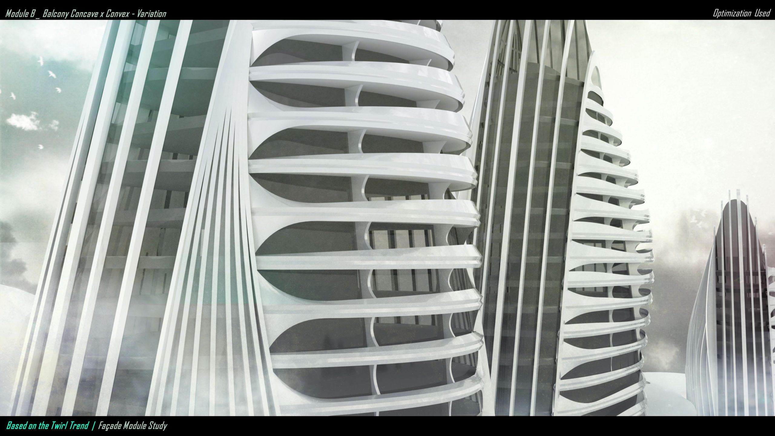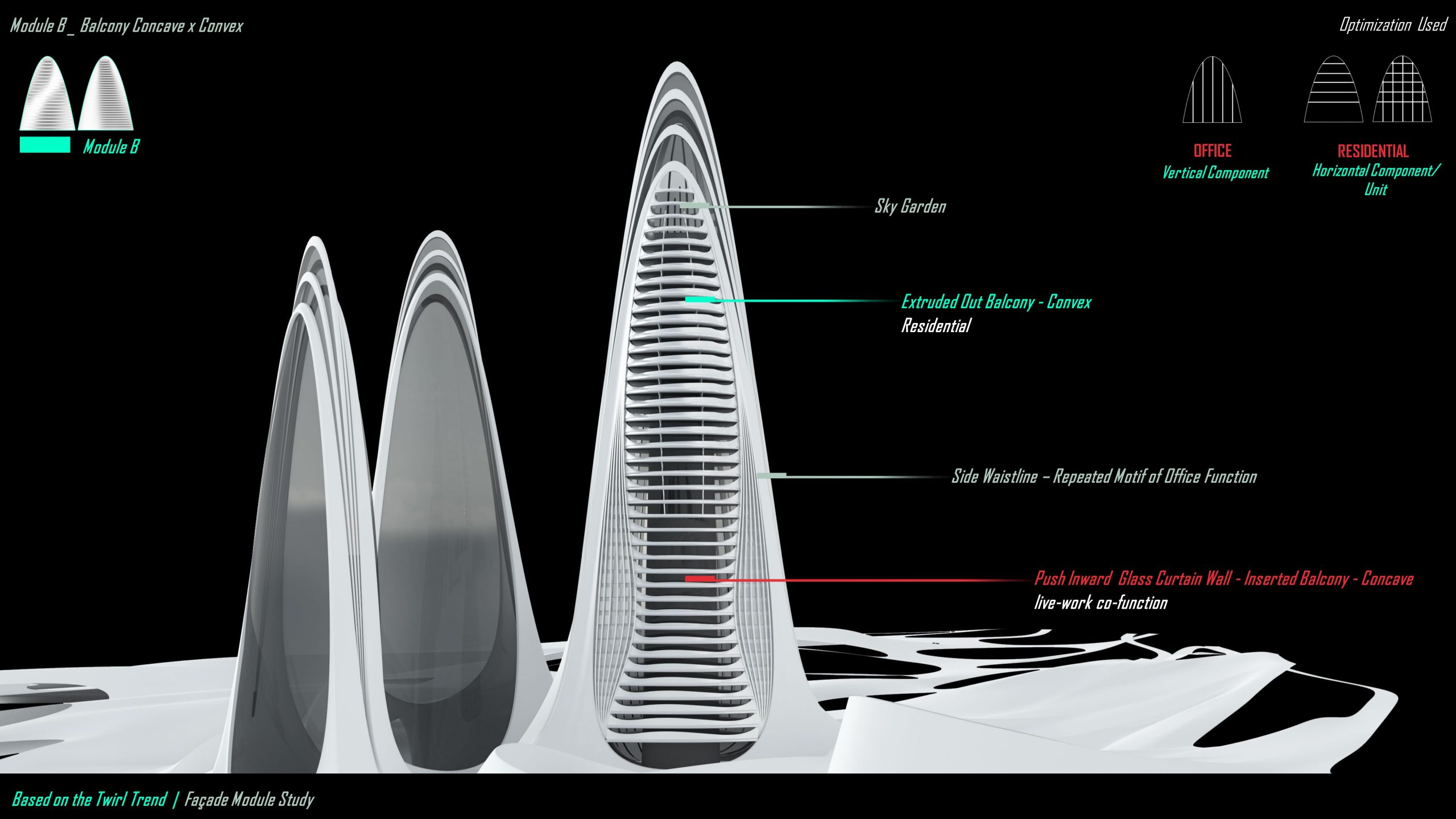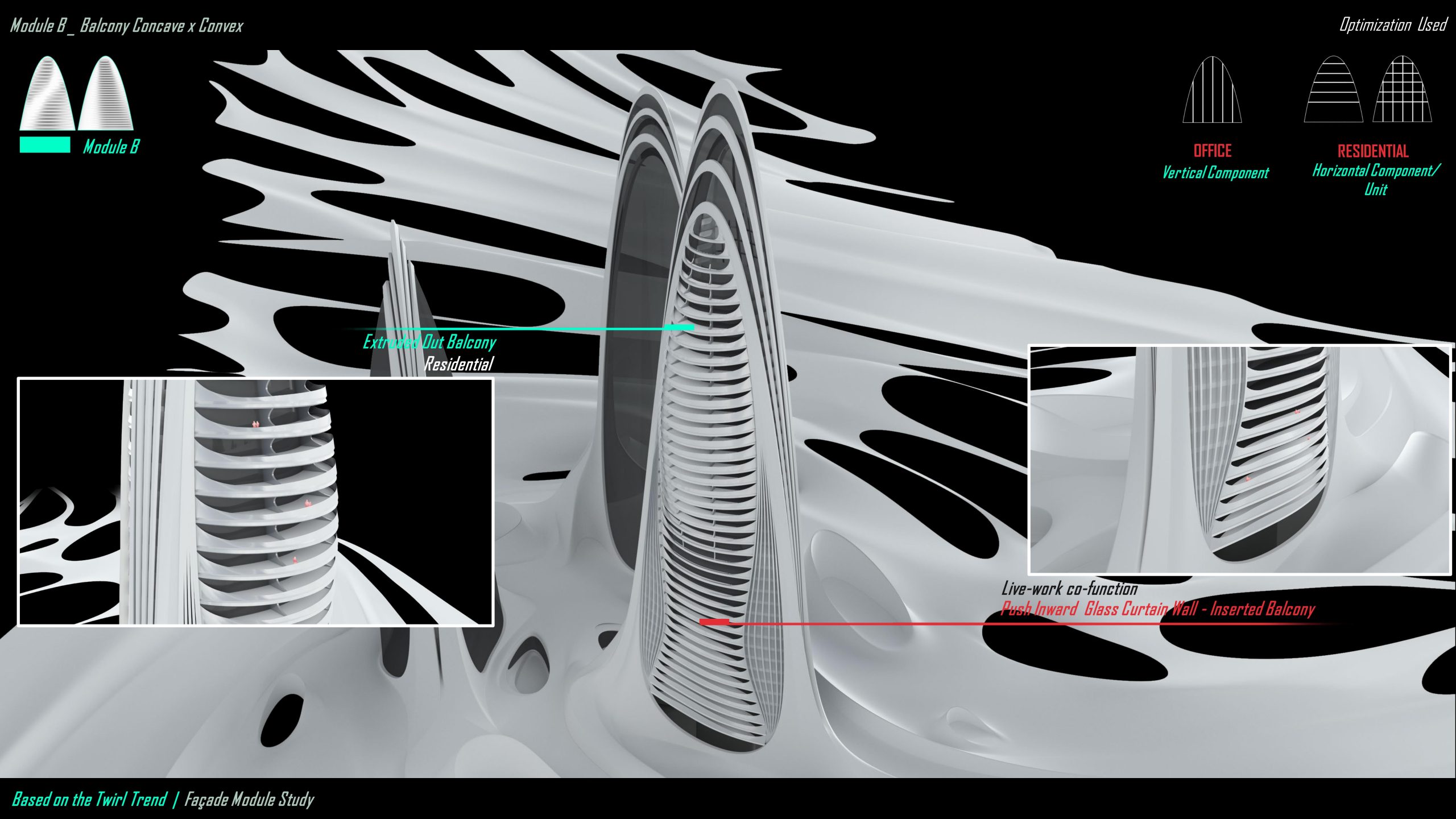 For module B — the mainly horizontal element facades, we tried to blend concave and convex balconies to distinguish purely residential and live-work co-function. The side waistline with vertical fines is a repeated motif of the office function, showing a mixed-use possibility of the bottom part.