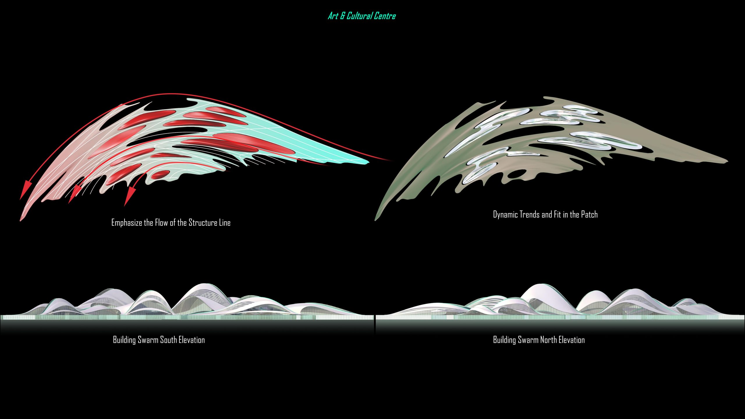 For the art and culture centre, it gradually transfers into a stretched-out and lowered gesture. We would like to connect the slender massing group by group to enhance the trend of the flow.