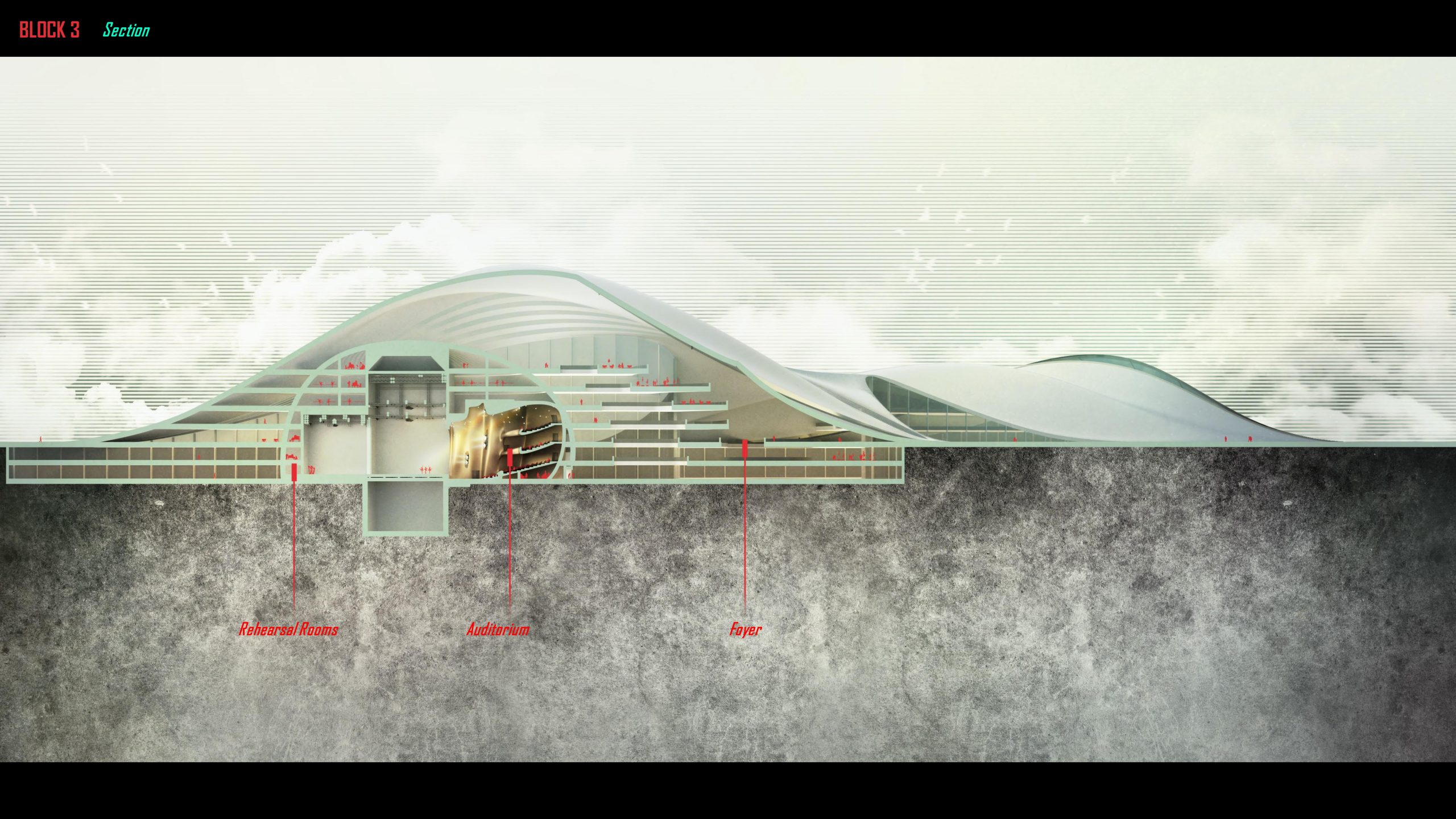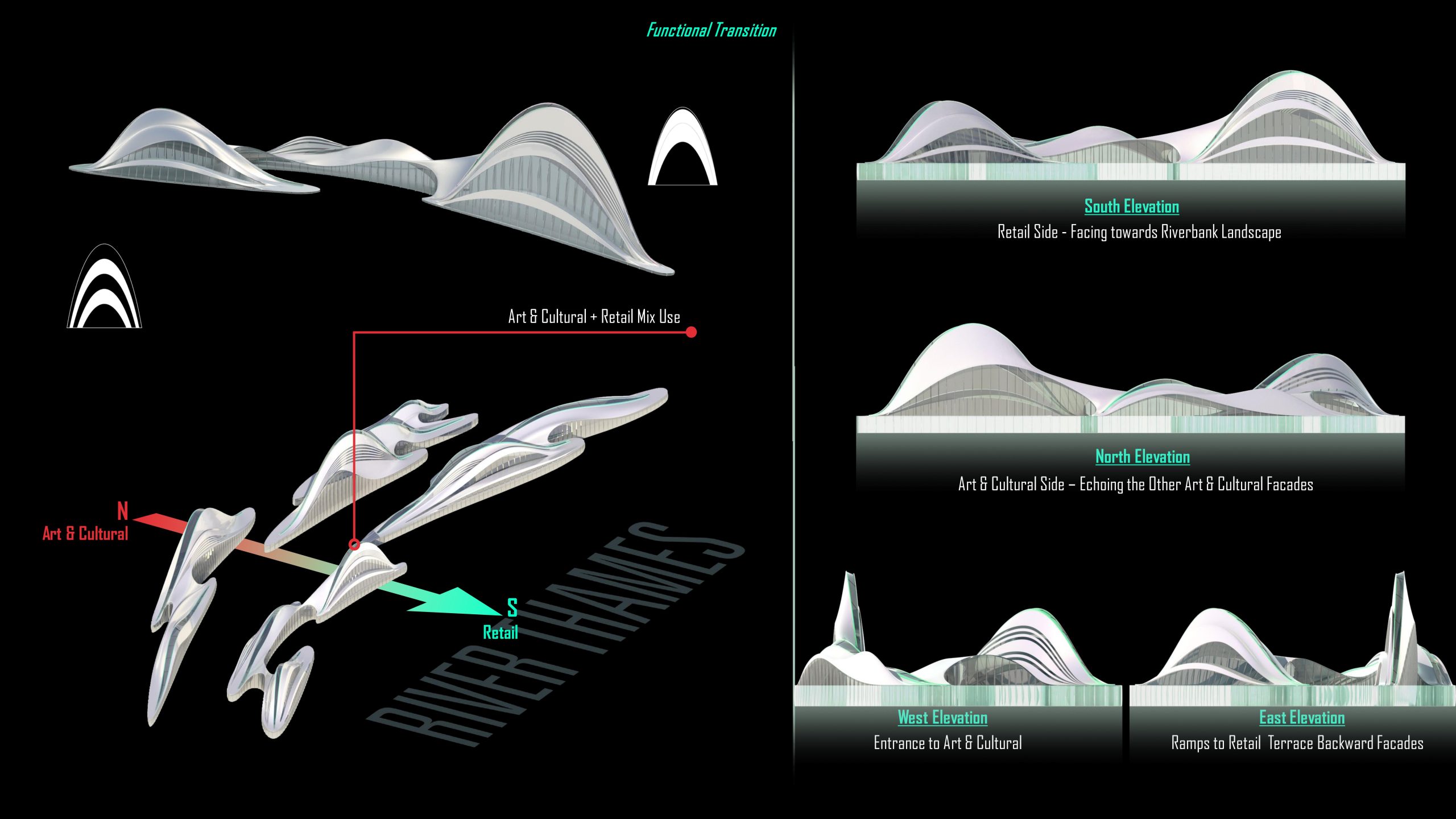 The ribbon-like horizontal element separates from the folding skin, transforming ramps into the terrace backward retail facades. We hope this combination of forms can achieve a smooth transition between functions.
