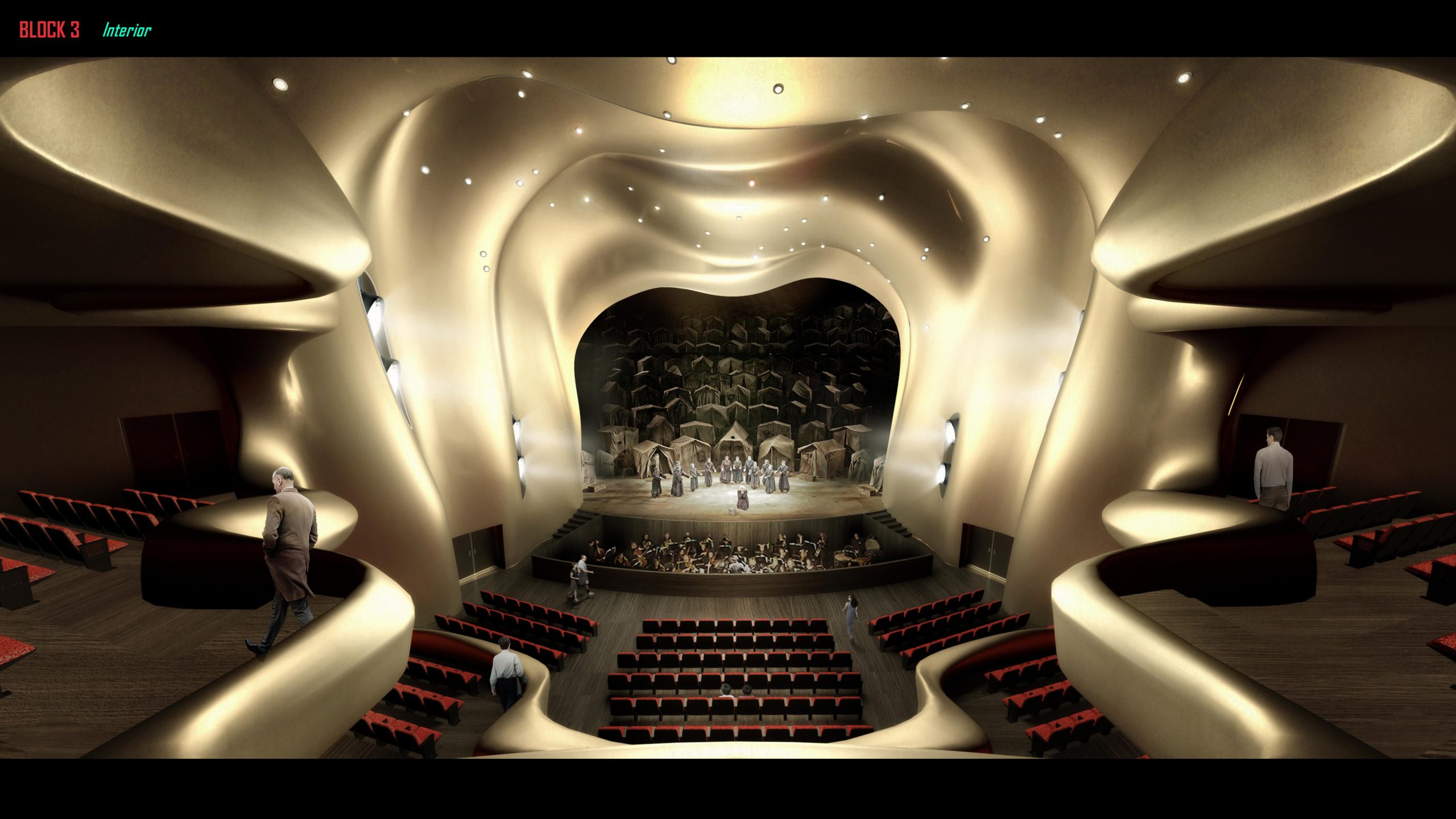 The folded skin that covers the art and cultural centre slowly narrows into a ribbon-like terrace backwards facade, and finally into a ring-like roof façade form.