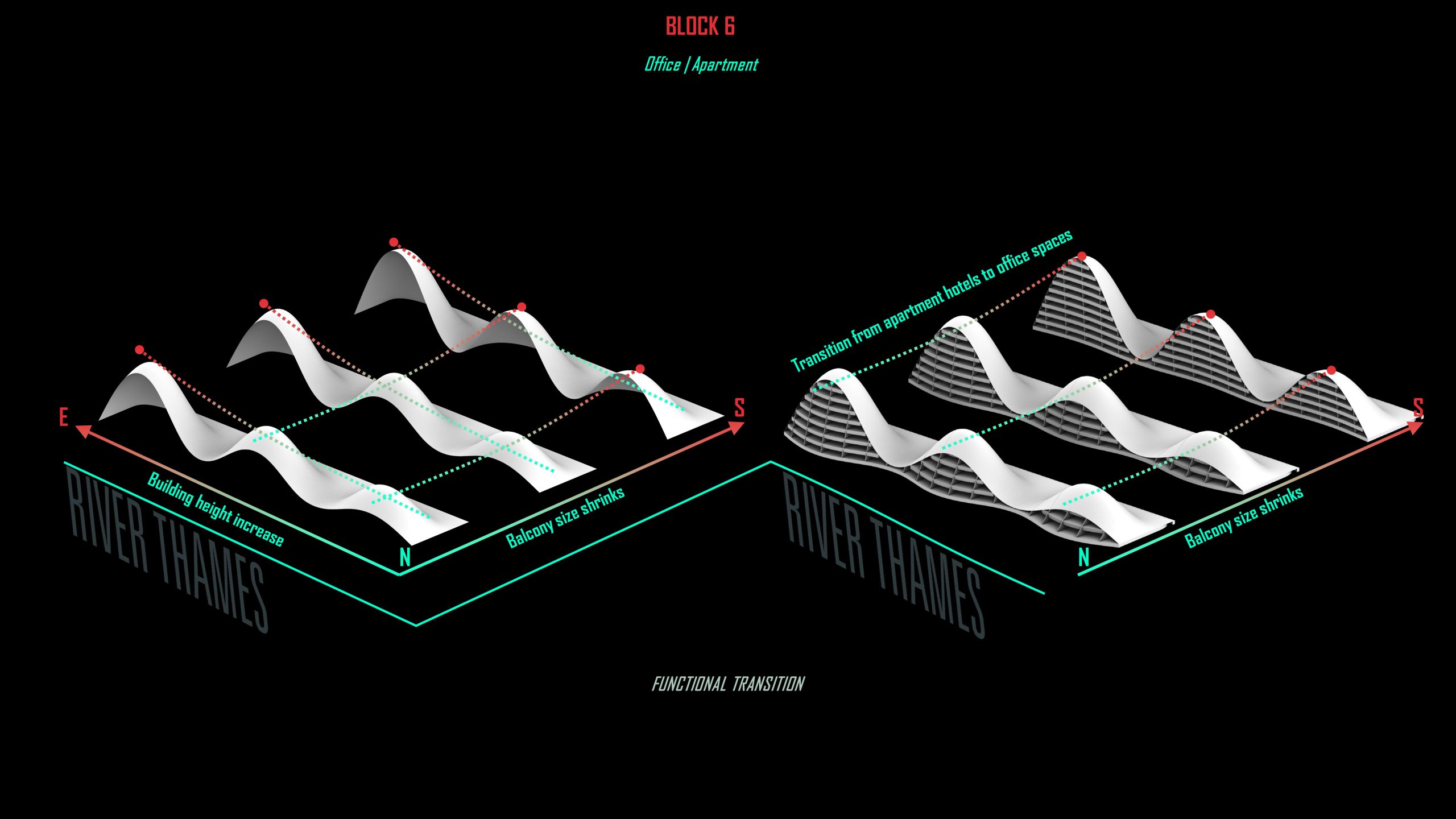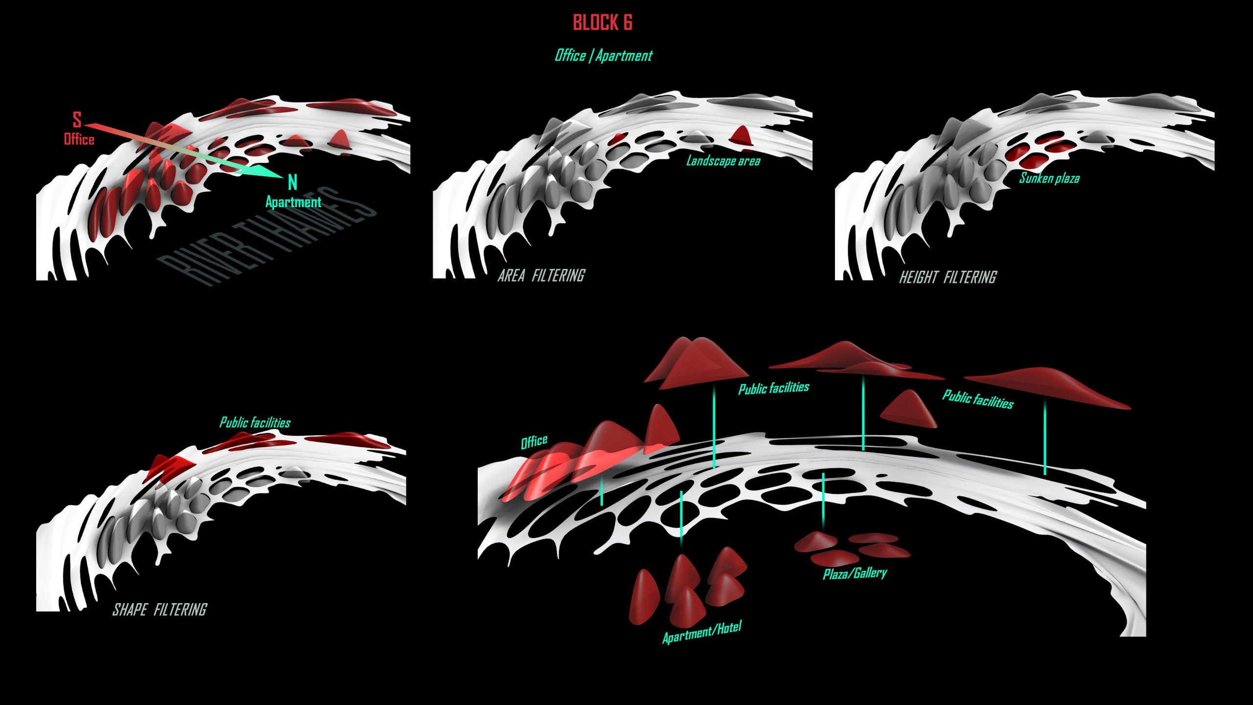 We classify Block 6 in four methods, office and apartment are distinguished by their distance to the river bank. Then we remove volumes that are too small and turn other low volumes into a landscape surface. Finally defining function by its shape, those that are too slender become public facilities.